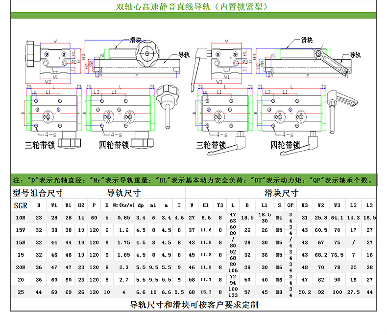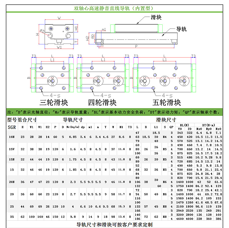 • 內置雙軸心直線導軌滑塊鋁合金滾輪高速SGR B10N 15 20 25 35滑軌